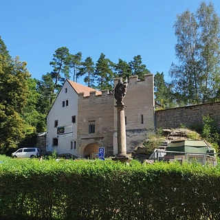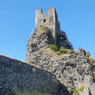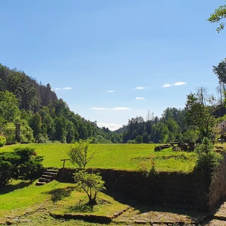 In Turnov, the trail passes below the state castle Hrubý Rohozec, which is accessible in summer via the Castle Educational Trail. Nearby in Dolánky stands the national cultural monument Dlaskův Statek. We continue through Bukovina to Drábovna — a small rock town reached by crossing a main road. The next highlight is the ruins of Frýdštejn Castle. From there, the route drops along the Vranov Ridge to the Pantheon. The trail ends at the Zahrádka viewpoint, offering views of Maloskalsko, before descending into the resort town of Malá Skála.