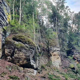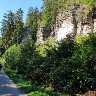 From Mnichovo Hradiště, we follow the red trail to the ruins of Valečov Castle. Along the way, we pass former rock dwellings, originally used as Hussite winter shelters and inhabited until the late 19th century. After climbing to the castle plateau, we pass the remains of the Píč farmstead and a turnoff to Klamorna, a former rock castle. About 1 km further, we reach the Drábské světničky, where only carved sandstone rooms and timber slots remain. We continue through Studený průchod to a scenic viewpoint at the Příhrazské skály (this section includes stairs and ladders!), then head through Srbsko to the U Pomníků crossroads, marked by a memorial to the 1866 battle. Our final stop is Kost Castle, just 1 km away, and from there we walk through the Prokop Valley to Libošovice.
