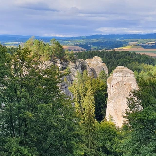 Although the Prachov Rocks are no longer part of the official Golden Trail, we offer an alternative route to include them symbolically. From Jičín, follow the red trail to Prachov and continue to the tourist lodge. Several marked loops lead through the Prachov Rocks (expect stairs and narrow passages!). Return to Jičín via the blue or green trail through Brada and Kbelnice.